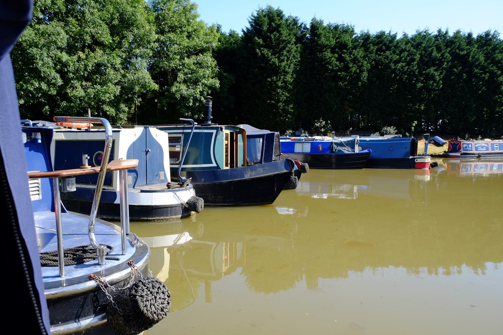 Keeping Song & Dance squarely in the middle of the cut, as we came round the corner and bridge towards the junction we were definitely scraping the bottom a little, but chappie in front had got his back end firmly stuck up against the side of the canal. The best way to unground oneself is usually to put the boat into reverse and apply quite a lot of power. This not only reverses off the problem bit rather than digging in further, but helps by shovelling water under the boat. However, chummy was digging in his rear end using loads of forward power, while trying to snap his bargepole. He waved us past (potential “hooray”), but while preparing to edge past gingerly, he applied even more power, and his front end swung right round across the canal, blocking any possibility of us going past (“bugger”). After a lot of energy expenditure and swearing, he finally managed to get things moving, while crashing around in the boats moored on the other side, and consequently abandoned all ideas of letting us past. (“Damn”).