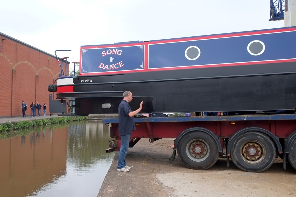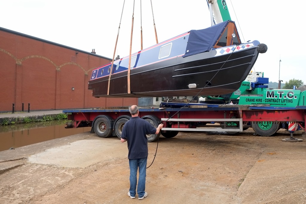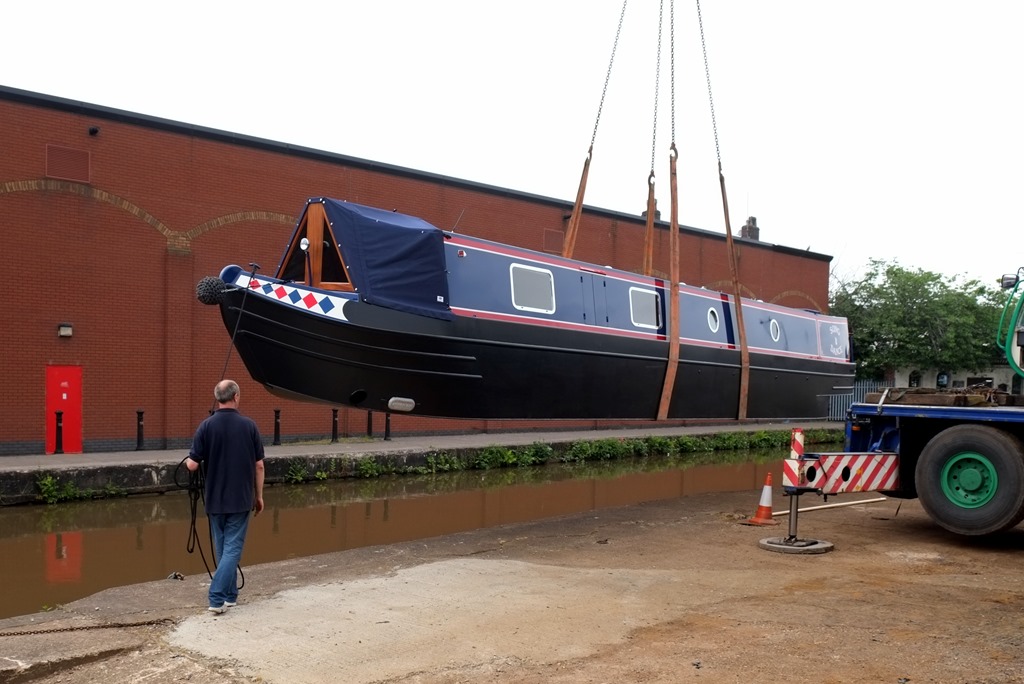 The salubrious surroundings of Longport Wharf are close and convenient, and the “launch” went without a hitch, although getting the lorry to the wharf was a challenge for the driver because of other boats parked on the hard standing, not normally there. Nothing’s ever easy.
