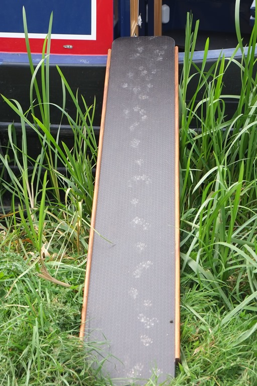 Finally, mooring up outside the 3 Magpies at Scotts Wharf – a favourite pub/eating house from previous visits – the 3.75 miles (is that all?), 29 broad locks (gulp!) and lack of lunch decreed an early dinner cooked by someone else and an early night. We appear to have had a cat-burglar during the night: CSI pawprint division have been summoned.