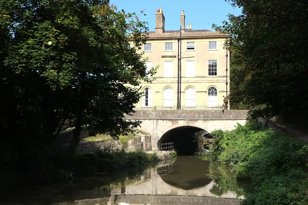 The canal running along the back of Sydney Gardens was a peaceful haven; the large building over the tunnel was the HQ of the K&A canal in the early days.