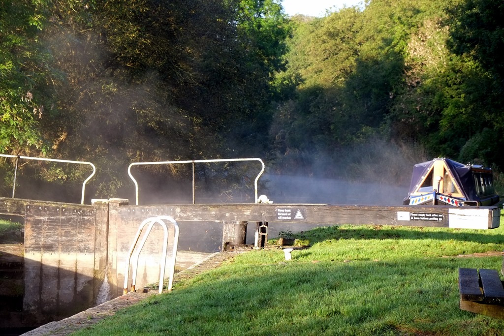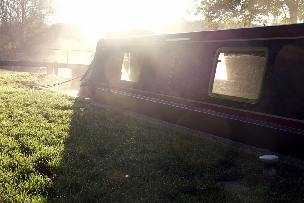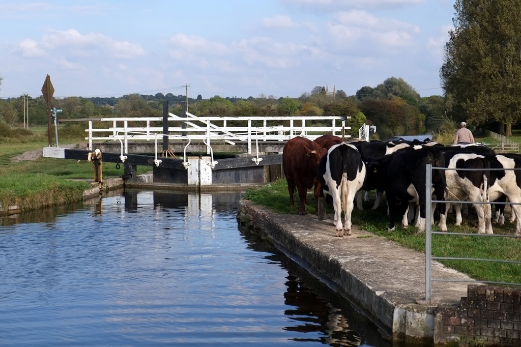 With CaRT’s minimalist approach to mowing the grass these days, it’s bad enough with anti-social owners who let their dogs fowl the lock area without clearing up the excrement, leaving the long grass booby-trapped. But a herd of cows wandering everywhere adds a whole new dimension, particularly the one who turned, reversed and lifted it’s tail over the canal just as First Officer Fran was on short finals to the gate. The bilge pump in the front well-deck had a narrow escape.