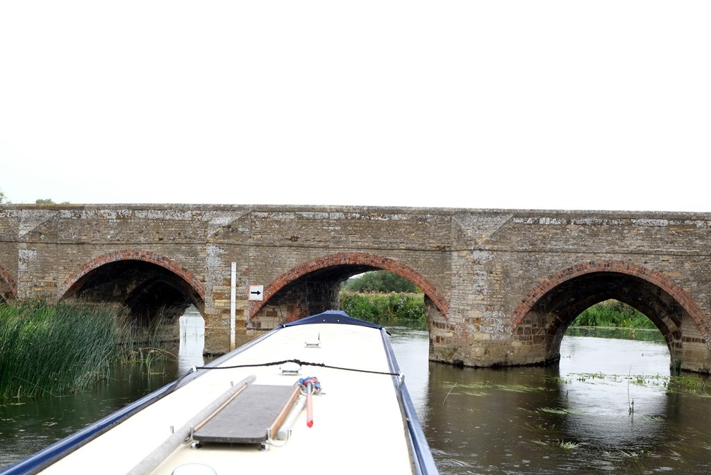 Tuesday: setting off from our field near Ditchford and bumbling further down river the weather wasn’t that great but the scenery pleasant enough, with the occasional navigational challenge thrown in. Wouldn’t fancy Irthlingborough Road Bridge when there’s a serious flow on, but the cook coped admirably.