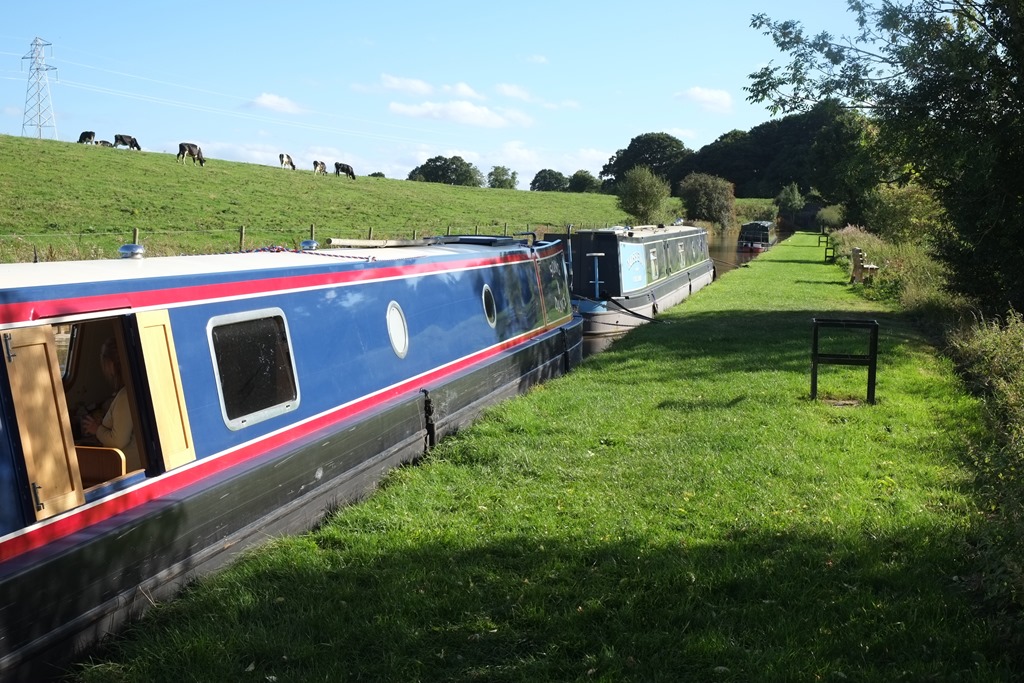 We’d just settled down to dinner when we saw Betelgeuse and tug passing us again, and thought “Gosh – are they really going up the Bosley Locks at this time of day with an unpowered butty? They won’t get finished before dark…”, and a minute later Charlotte stuck her head through our side hatch and said “Ah, it is you!”. Seems Betelgeuse is her and Jason’s boat/home, and they were heading for some kind of boaters meet at Bollington at the weekend. But as they were both working during the day they could only move the two boats in the evening. Turned out she actually worked at Swanley Bridge Marina, where we’d left Song & Dance to go to Sidmouth. Small world.