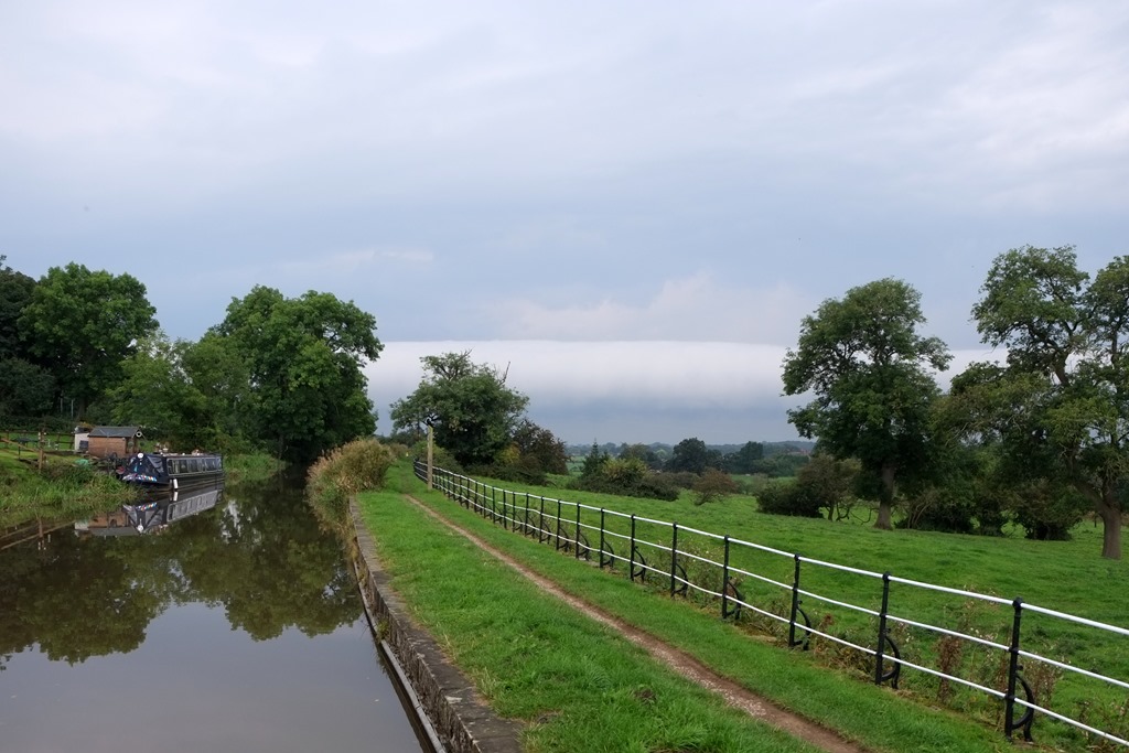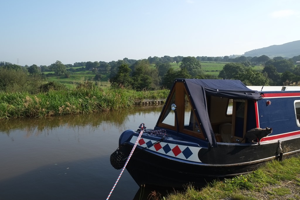 The canal takes a dog-leg route of several long straight sections around Congleton, bypassing the town centre by more than a mile. But it goes right by the station (actually, pretty much under the station), where there is a decent pub for a lunchtime Guinness, and a convenience store for milk. So by the time we reached the much regarded moorings just below Bosley bottom lock, it was late afternoon. And warm and sunny. With a nice view. So all things considered, we decided to leave tackling the Bosley Lock flight – 12 deep locks in just over a mile, with no possibility of mooring until the top – for another day, and get the deck chairs out. It really is a nice spot, with great views over the River Dane valley, and a local hill known as The Cloud for some reason.