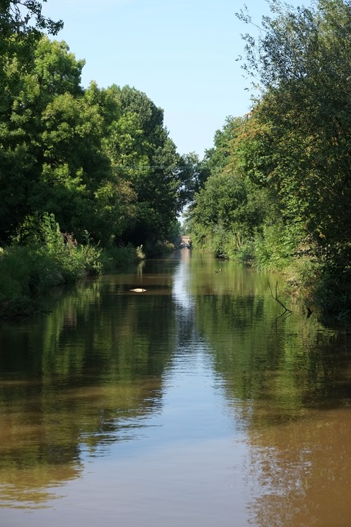 The canal here consists of long straight sections (no pansy contouring here) and the frequent bridges have an odd elliptical shape, rather than finishing vertically at ground level, like almost everywhere else. They have a narrow channel, and most have a significant ledge on the non-towpath side just at water level, almost invariably hidden by the undergrowth. This makes them an interesting challenge to pass without hitting anything too hard.