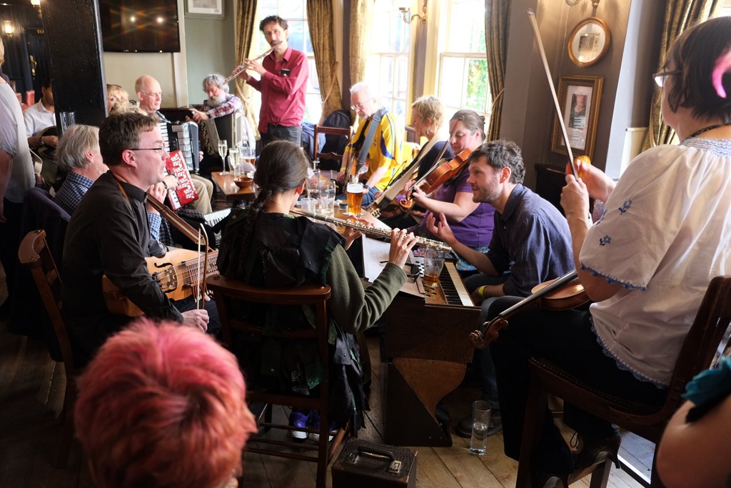And where else but Oxford would you stumble onto a pub sessions with three nyckelharpas, a viola, the smallest portable harmonium ever seen, and an Arabic looking gentlemen playing a black-skinned banjo, as well as the more usual accoutrements?